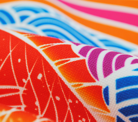 昇華転写捺染という方法で染めます!デジタル染色と呼ばれる昇華転写捺染は、転写紙にインクジェットプリントした柄を生地に転写させる方法なので、どのようなデザインも製作可能。大漁柄など賑やかでおめでたいデザインを染めることの多い額縁入り旗にはピッタリの製法です。その上、帆布との相性も良く、発色も抜群で長持ち!