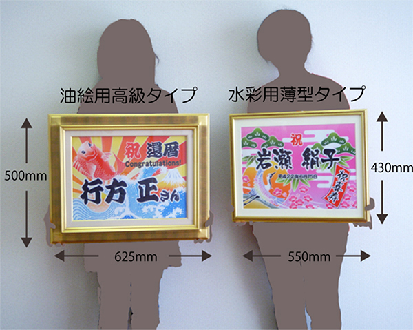 水彩用の薄型タイプの2種類をご用意。額縁は、油絵用に使われる重厚な高級タイプと水彩用でお買い求め易い薄型タイプの2種類をご用意。額縁の色はいずれも豪華に見える金色です。高級タイプの方が額縁のサイズは大きいですが、旗の見える部分はほぼ同じです(サイズ感参照)。