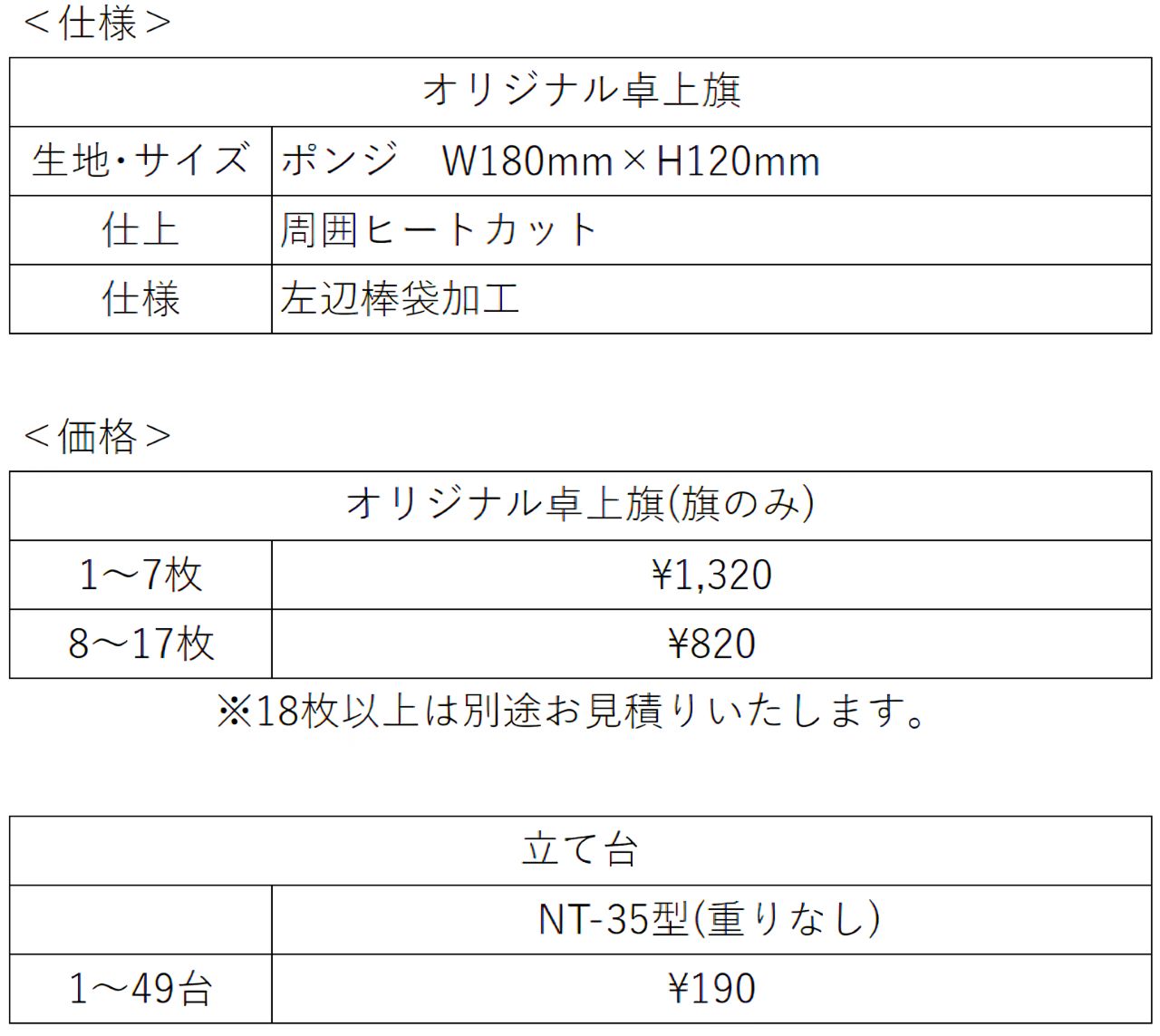 あいにく、オリジナル卓上旗は、カートには対応しておりません。