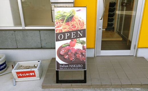 商店街は車の通行ができないところが多く、基本的には自転車や歩行者がメインターゲット。そのため、自分の背丈からやや低いくらいの看板が目に留まりやすいのです。営業中は店先に出しておき、時間外にはしまえる扱いやすさもポイントの一つ。イチオシ商品の写真を入れて、購買意欲を搔き立てましょう。