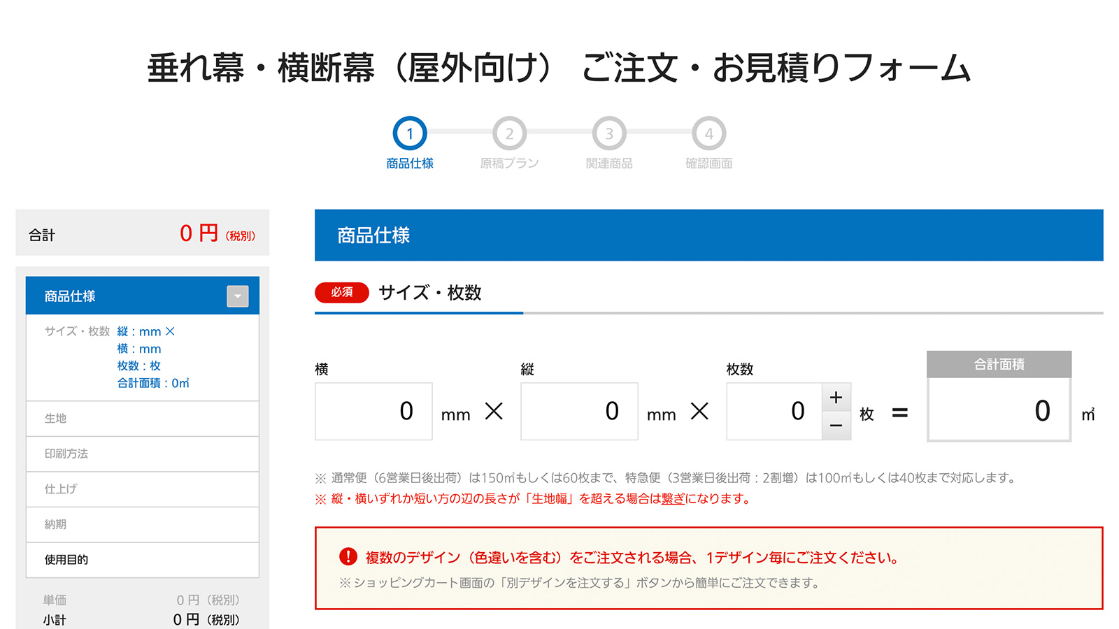 ご注文フォームでは枚数やサイズ等予め入力されている項目もありますが、入力されていない項目、例えば、印刷方法や仕上げ方法、納期などは上から順にご選択ください。ご選択にあたっては、説明文や写真、動画等、入力補助情報を詳しく掲載していますので簡単にお選びいただけます。最後の使用目的にお答えいただけますと、それに合った他のお勧め商品をショッピングカートページでご案内差し上げることができます。