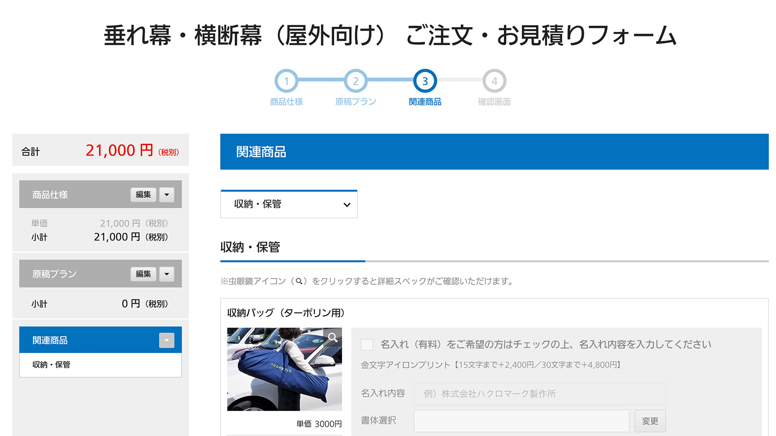 ご注文フォームの最後は、各商品に付随する関連商品の選択画面です。ポールや立て台、三方剣や金球、黒玉などの旗頭及びそれらを収納・保管するバッグやケース類他、テーブルクロス止め、パーテーションフック、吸盤など、設置に必要な、あるいはあれば便利な商品も多数ご案内。お客様の多様なニーズにお応えするため、製品ごとに様々な関連商品をラインナップしています。