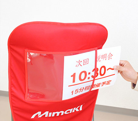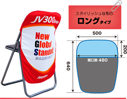 パイプ椅子に掛けて使用するオリジナル椅子カバーは、テーブルクロスやタペストリー、バナースタンド、のぼりに並んで、今や合同企業説明会や会社説明会、展示会の必須アイテムで、来場者の目を引く為にもはや欠かせないツールです。実際、地味で目立たなかったブースが華やかな雰囲気に一変したとのお声が続出。