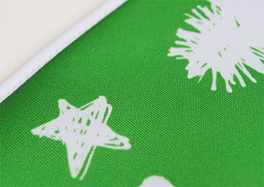 印刷された生地とウレタン素材のスポンジを縫い合わせ、周囲をバイアステープで仕上げますので見た目も綺麗です。