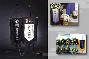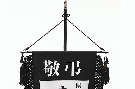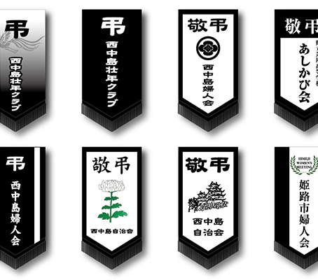 老人会や自治会、各種団体の葬儀、告別式で使用する敬弔旗が、昇華転写捺染という製法で高品質かつ低価格でお作りできます。自由に変更が出来るデザインサンプルを豊富にご用意していますので、お好みのデザインを選んで簡単にご注文ができます。もちろん、お持ちの古くなった旗を新しく作り変えることも出来ます。