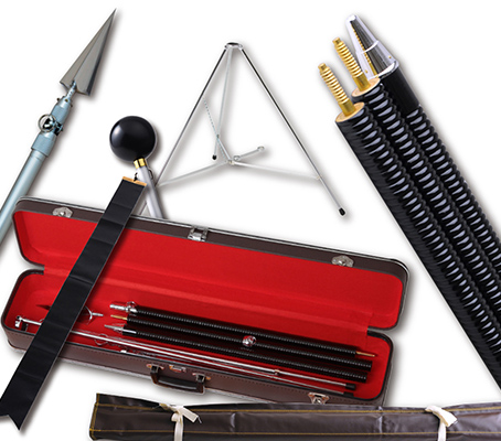 関連商品も豊富にご用意!特製黒塗り千段巻棒や黒玉などの旗頭、三脚立て台の他、敬弔旗を含めてそれらが全て入るレザー張りデラックスケースなど、敬弔旗を使用または保管する上で必要あるいは便利な関連商品も豊富にラインナップしています。