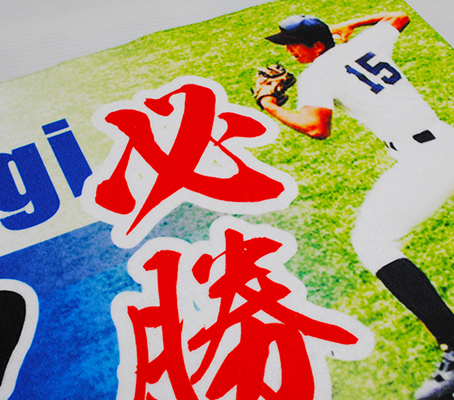 オリジナルタオルが作れます。それは印刷方法が昇華転写捺染だから。印刷するデザインや最低ロット等の制約が一切ありませんし、色数も関係なく値段は同じ。この印刷方法とポリエステルという素材が相まって、カラフルで発色の良い「見せるタオル」が一枚から低価格で製作できます。