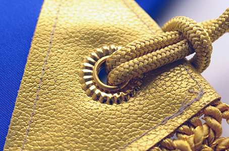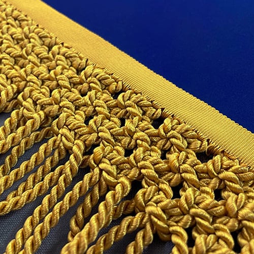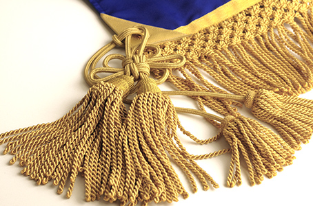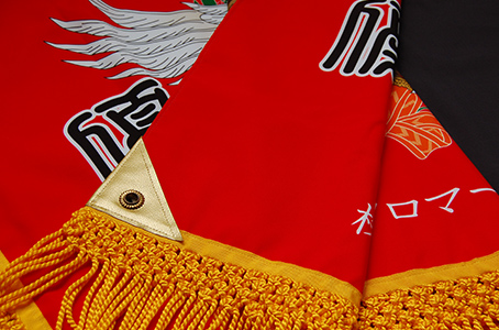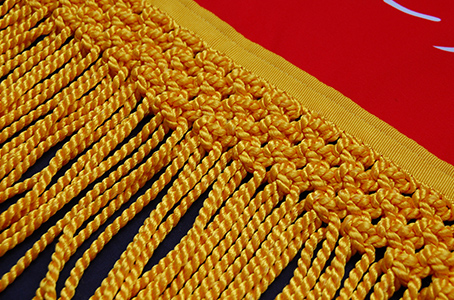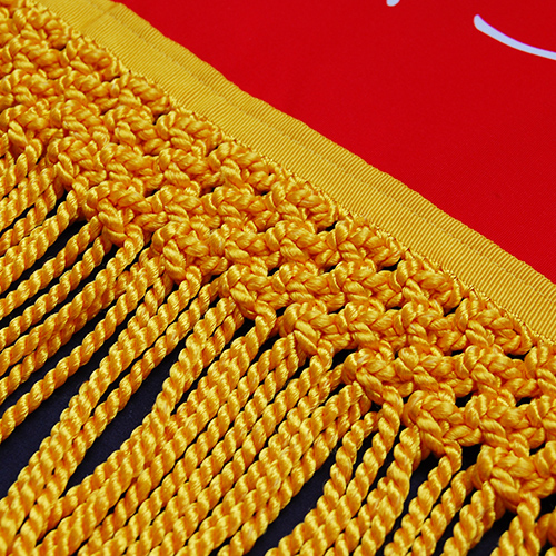 01フレンジが異なる2タイプの優勝旗をご用意!表裏2枚の間にネル芯を入れて縫い合わせ、周囲を四段七宝結びのフレンジで仕上げます。フレンジが橙色糸の金茶タイプと、金色糸で豪華に見える金色タイプの2種をご用意。オリジナルで作る優勝旗にもかかわらず価格もリーズナブル。