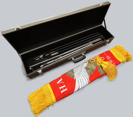 関連商品も充実!特製黒塗り千段巻棒や三方剣、三脚立て台の他、優勝旗を含めてそれらが全て入るレザー張りデラックスケースなど、優勝旗を使用または保管する上で必要な商品も豊富にラインナップ!注文フォームで併せて購入することができます。